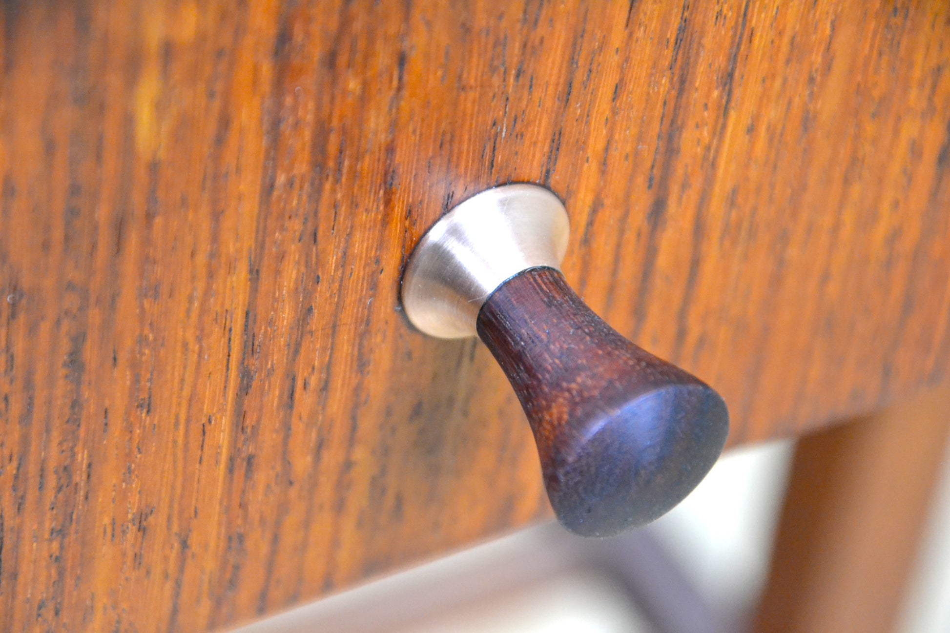 Restored Mahogany with Rosewood drawer front and detailed handle, capped with a copper ring.
