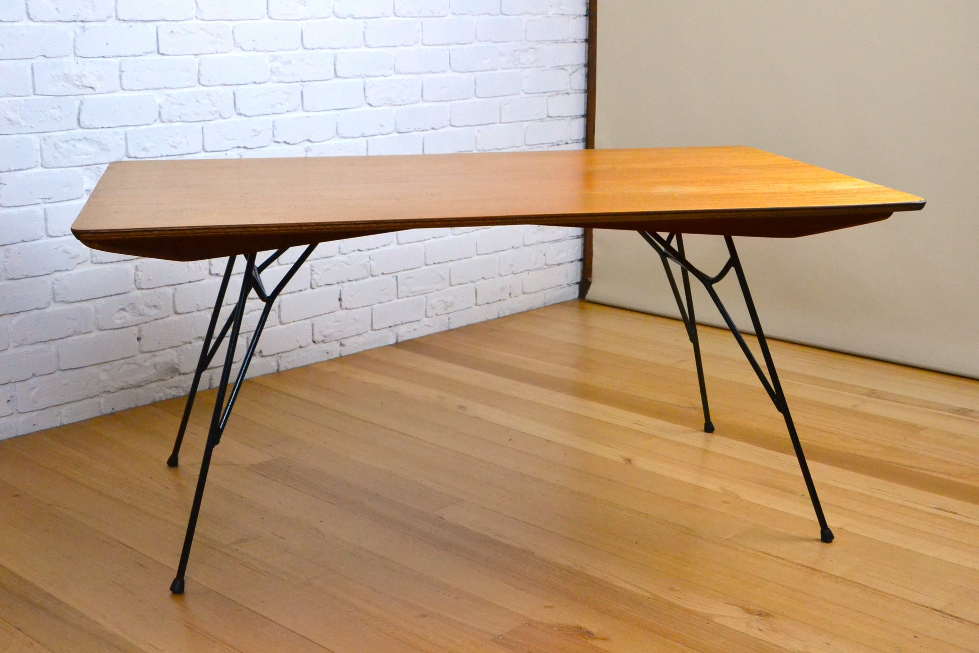 Queensland Maple plywood veneer top. Steel rod angular legs with rubber capped feet. Restored using all natural hard-wax oils.