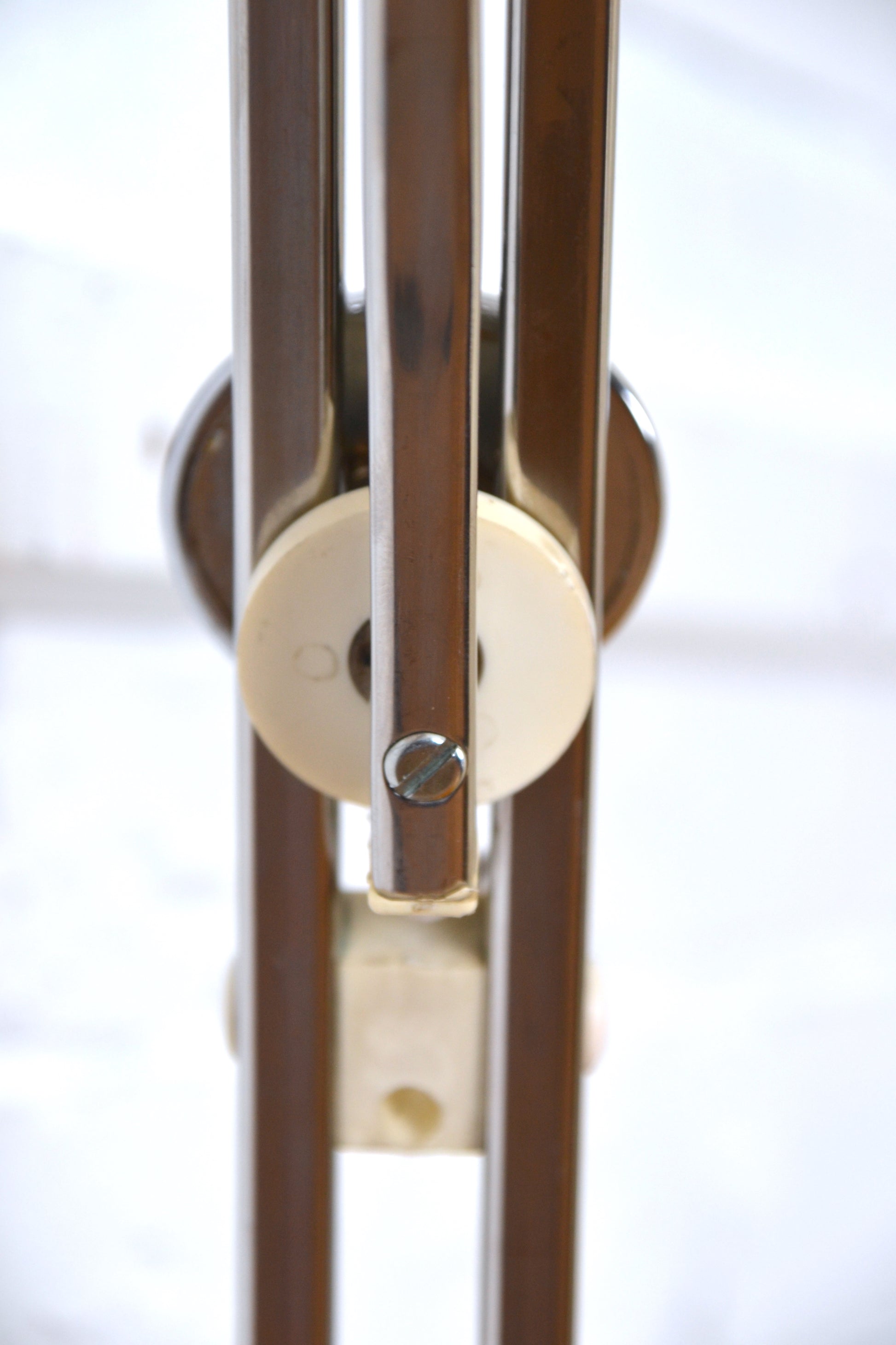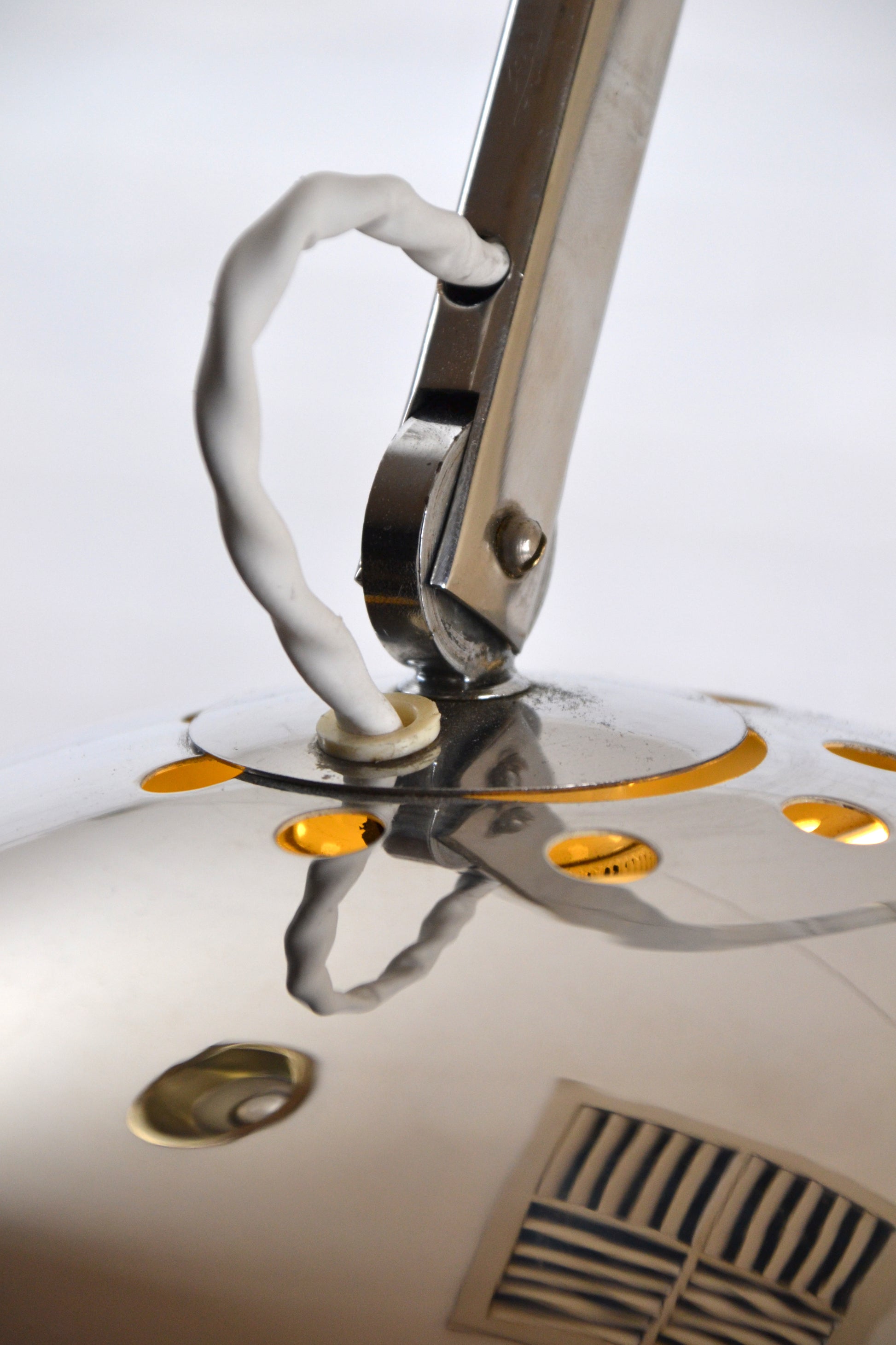 Full chrome construction, polished recently. Frosted perspex Helo shade. Lamp adjusts in length and pulls out from 1300 to 1950 mm.